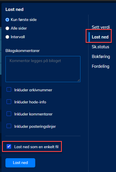 Ønsker å kunne velgePDF lagres pr bilag eller som 1 fil med samtlige bilag ille